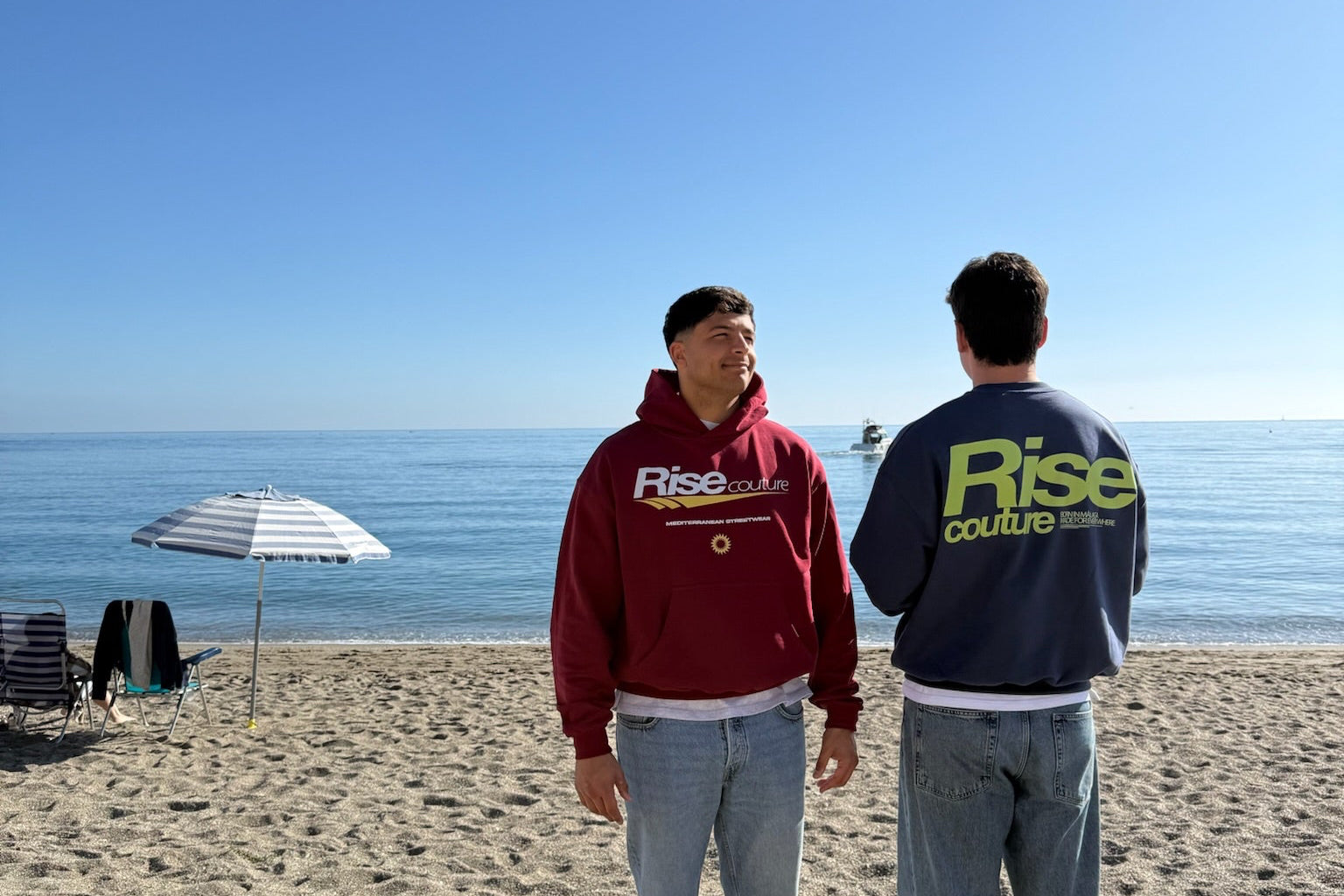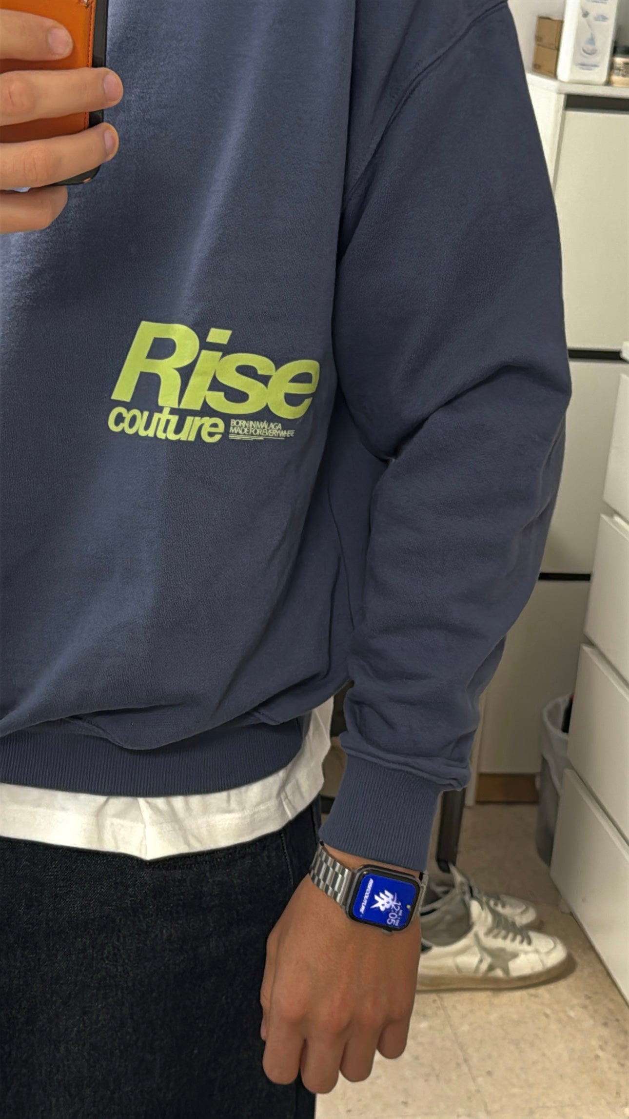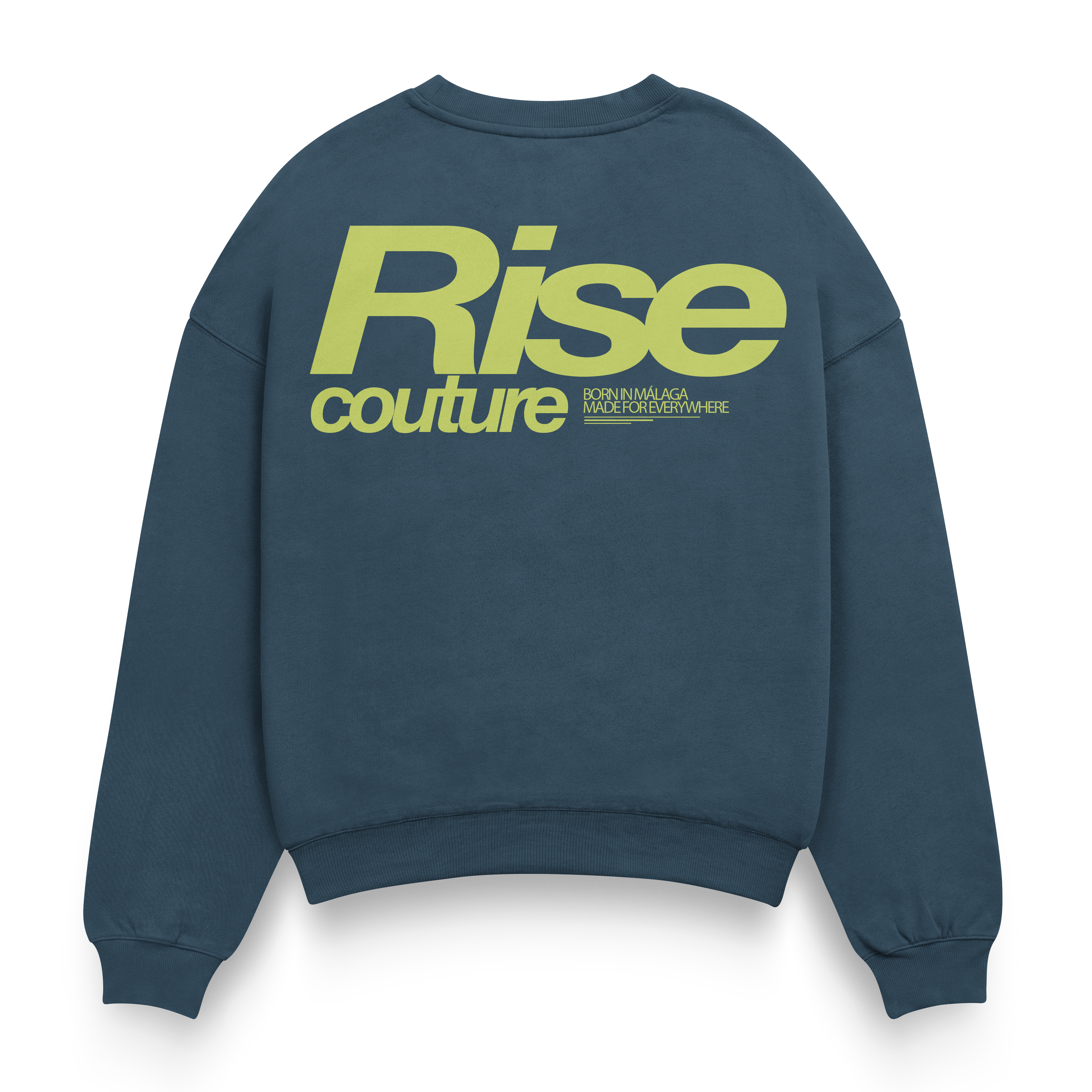 Crewneck RiseCouture en color navy blue con lettering en lima, diseñada en España y confeccionada en Portugal con algodón orgánico 100% de 460 GSM, aportando peso, estructura y presencia. Presenta un corte boxy con fit oversize, acompañado de hombros caídos y doble costura, que definen una silueta amplia, recta y contemporánea. La impresión digital en ambas caras refuerza la identidad gráfica de la prenda, combinando contraste cromático y carácter en un diseño limpio y atemporal.